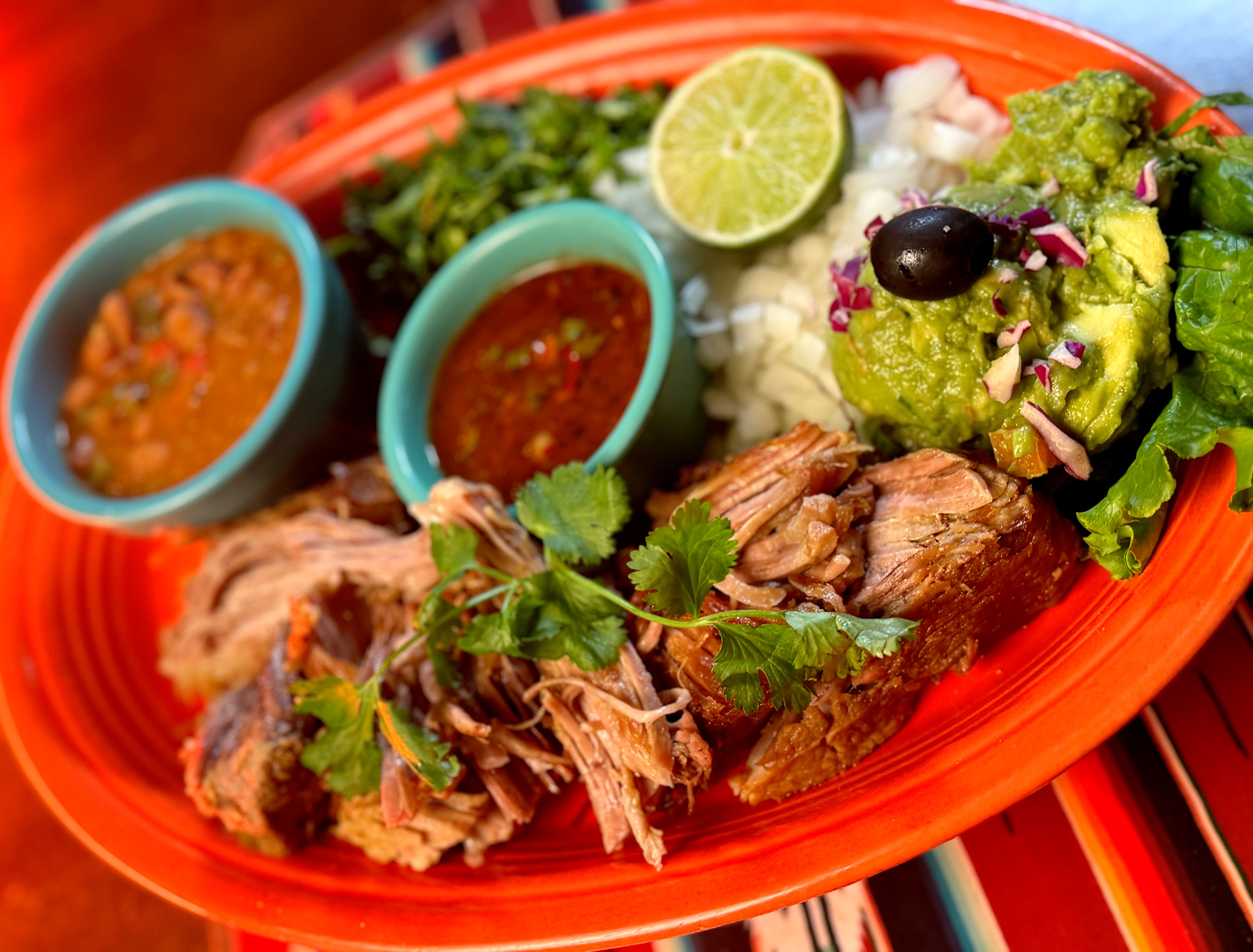 Slow-roasted pork that melts in your mouth, served with soft, hot homemade tortillas. Complemented by creamy guacamole, vibrant salsa, and homemade frijoles de la olla. A traditional Mexican delight.